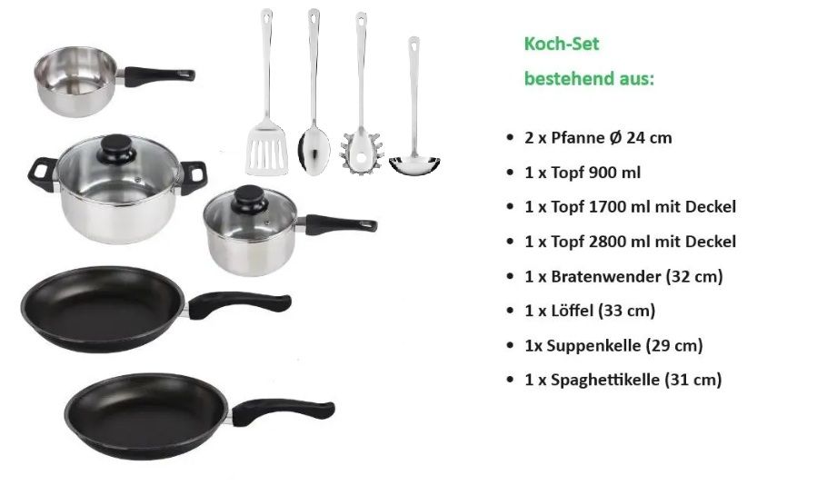 bestehend aus: 2 Pfannen ø24cm + 3 Töpfe (900+1700+2800ml) + Bratenwender + Löffel + Suppenkelle + Spaghettikelle