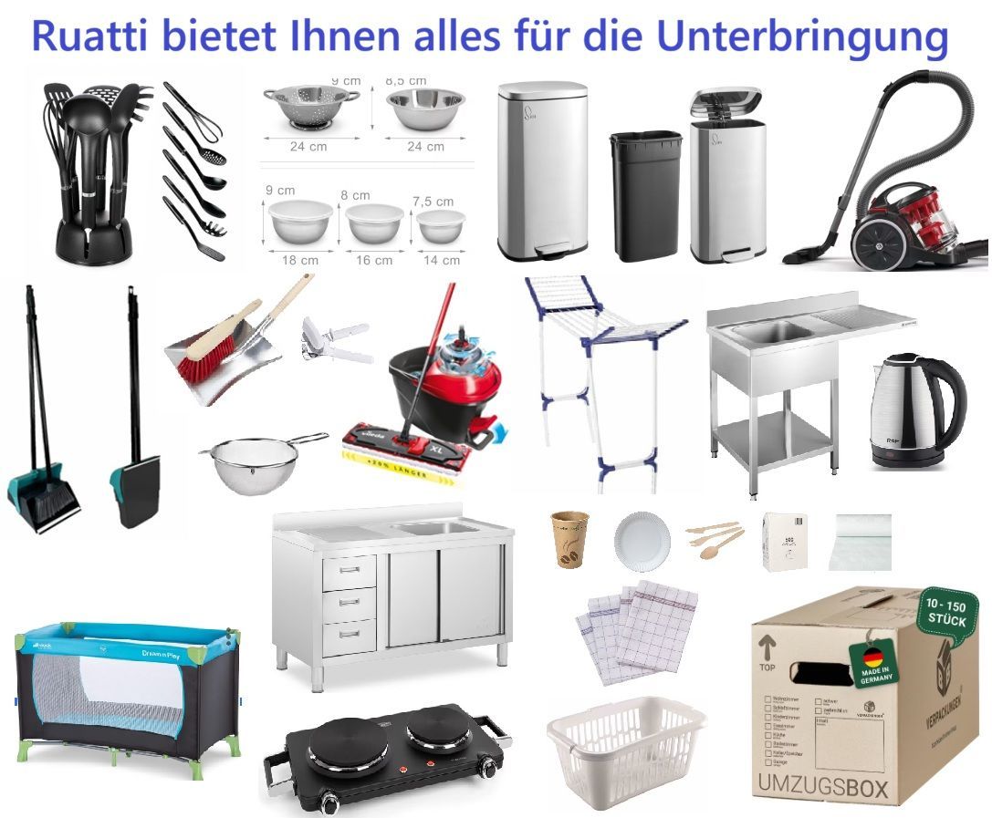Wir bieten Ihnen alles aus einer Hand, was Sie für die Einrichtung und den Betrieb Ihrer Unterkünfte benötigen (ein Auszug): Badetücher Badspiegel Becher Besteck Bettdecken Bettwäscheset komplett Boxspringbetten Container Deckenlampen Doppelspinde Dosenöffner Drehstuhl Einfache Gardinen Einzelbetten Einzelspinde Elektroherde Etagenbetten Familien-Schränke Federkernmatratzen Feuerwehrspinde Funktionsschrank Garderobe Garderobenhaken Gästetücher Geschirrsets Geschirrspüler Geschirrtücher Gläser Handschuhe Handtücher Handtuchhalter Hängeschränke Holzstuhl stapelbar Inkontinenz-Unterlage Kaltschaummatratzen Kasserolle Kehrsets Kinderbett-Set komplett Kissen Klappbetten Klapptische Kochlöffel Kochsets Kochtöpfe Kondenswäschetrockner Kosmetikeimer Küchen Küchenutensilien Kühl-Gefrierkombination Kühlschrank mit Gefrierfach Kühlschränke Kunststoffstuhl stapelbar Matratzen Mikrowelle Mülleimer Nachttischlampen Passiersieb Pfannen Plissee-Rollo Schlafsäcke Schöpfkelle Schüsseln Sideboards Spannbetttuch Sparschäler Spiegelschrank Teller Tische Toilettenhalter mit WC-Bürste Tretabfalleimer Trockner TV-Gerät Vorhängeschlösser Wärmepumpentrockner Waschbeckenunterschränke Wäscheständer Waschmaschinen Waschtrockner Wasserkocher Wischmob mit Wischeimer ... - dazu noch die Dienstleistung des Aufbaus bestellten Produkte - Ihre Anfrage einfach an Vertrieb@Ruatti.de oder Tel. 0157 33 73 6186, dann erstellen wir Ihnen gerne Ihr individuelles unverbindliches Angebot. Gerne schicken wir Ihnen als Behörde eine Übersicht mit Bepreisung. Sie haben weitere Bedarfe für Ihre Unterkünfte? Dann sprechen Sie uns bitte an. Ihr Klaus Lino Ruatti